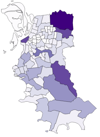 E ao plotar o resultado em um mapa coroplético de intervalos iguais (estilo graduado no QGIS), concluímos o óbvio, mas agora uma obviedade baseada em evidências: