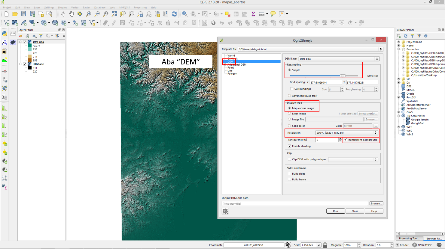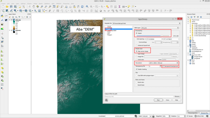 DEM significa Digital Elevation Model, o nosso MDE, em bom português. Essa aba é um verdadeiro parque de diversões. Aqui se configura a densidade de amostragem no MDE e a resolução da renderização 3D. Recomendo pegar leve no ínício, pois renderizações muito pesadas podem travar a sua máquina!