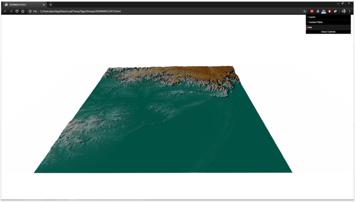 Clique em “Run” e o complemento irá criar uma renderização 3D navegável em uma aba do seu navegador de internet padrão. A depender do tamanho do MDE e das configurações de reamostragem e resolução, você pode ir no banheiro ou pegar mais um café enquanto o processo está em andamento. É possível salvar a página e as configurações para execuções em outra hora.