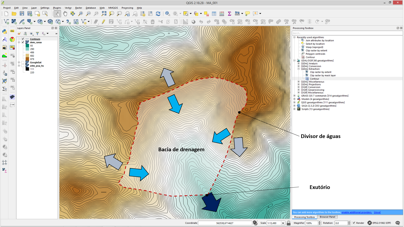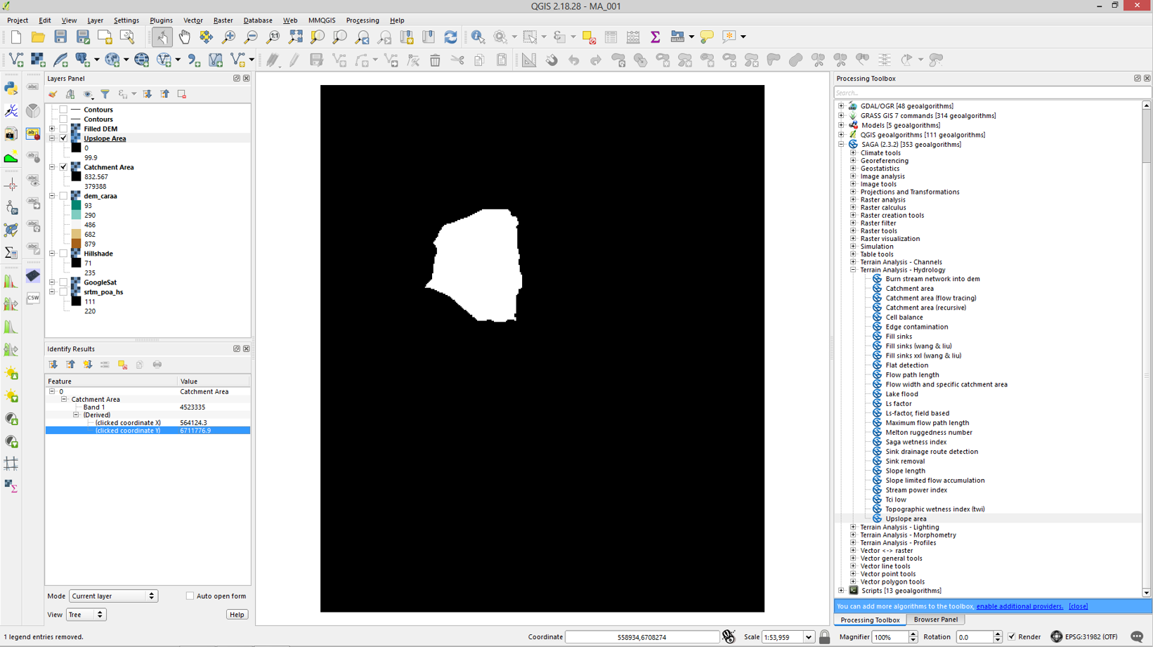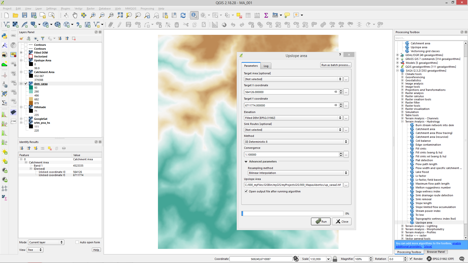Após obter manualmente as coordenadas do ponto de interesse, começa o segundo procedimento automático. Nesse procedimento, nós podemos ignorar o raster produzido pelo SAGA Upslope Area e focar somente no resultado final, o shapefile da bacia.