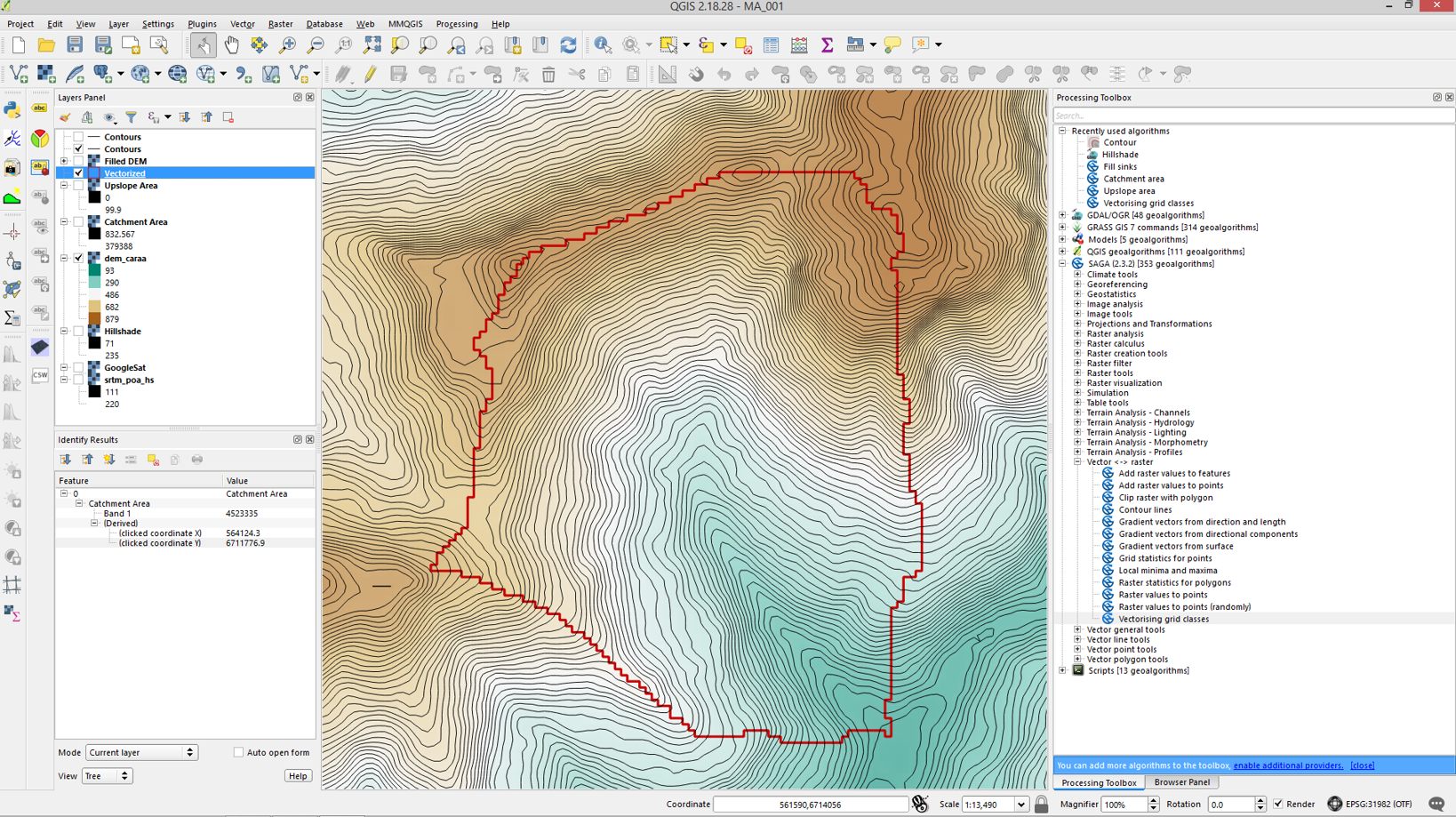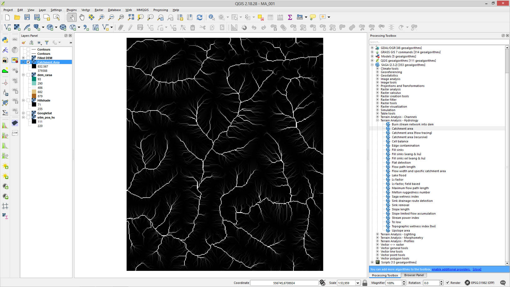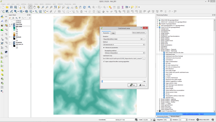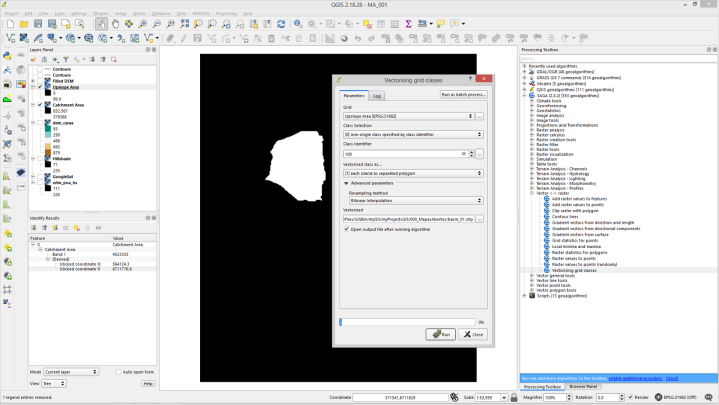 Após obter manualmente as coordenadas do ponto de interesse, começa o segundo procedimento automático. Nesse procedimento, nós podemos ignorar o raster produzido pelo SAGA Upslope Area e focar somente no resultado final, o shapefile da bacia.