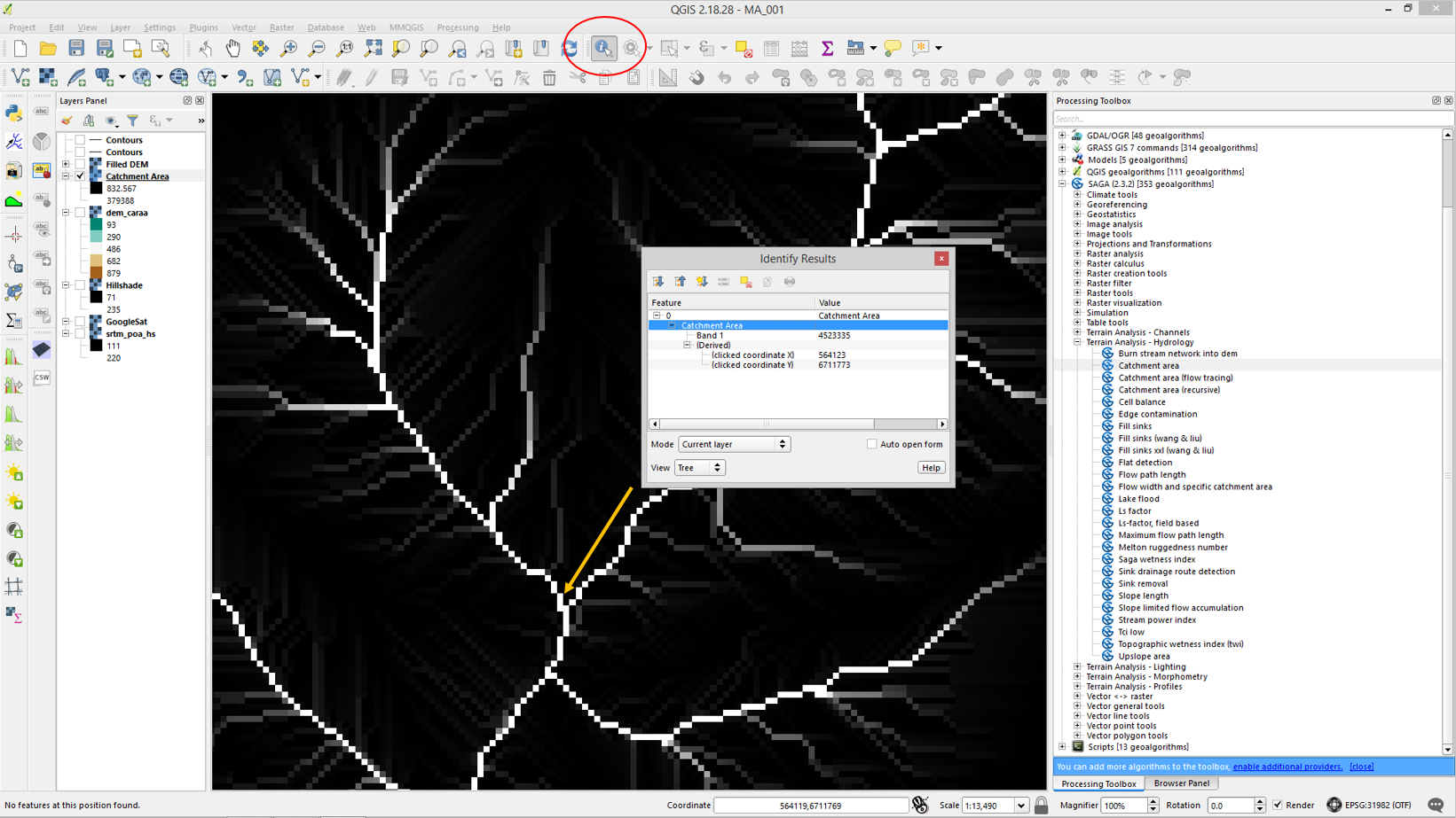 Com a ferramenta de indentificação (o cursor com um “izinho”) e a camada raster produzida pelo SAGA Catchment Area selecionada, clique no píxel que você quer que seja o exutório da bacia e avalie o valor de área de drenagem e as coordenadas X e Y. No meu caso aqui a área de drenagem deu 452 hectares. Copie as coordenadas em algum lugar, pois vamos usar no próximo passo.