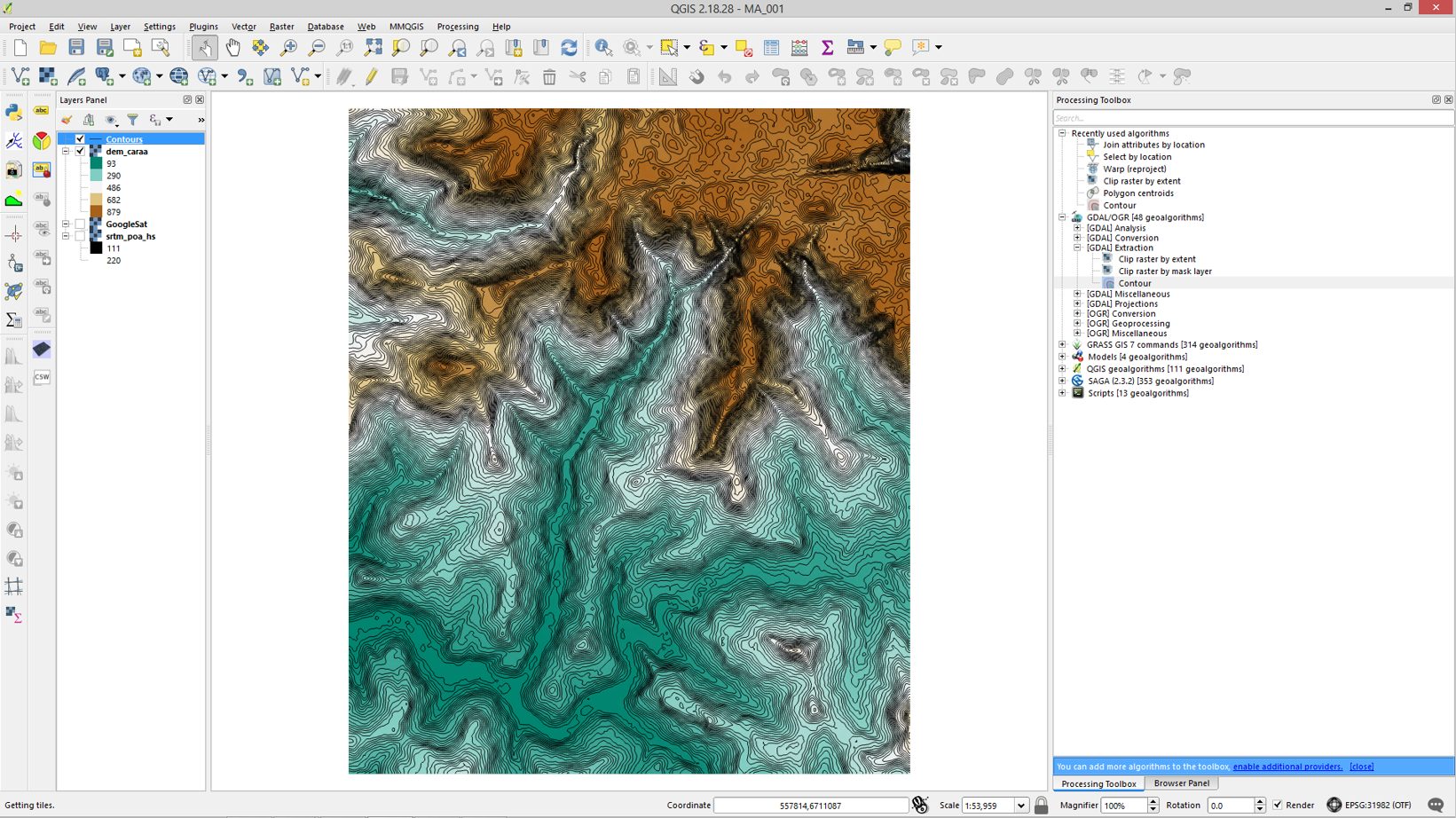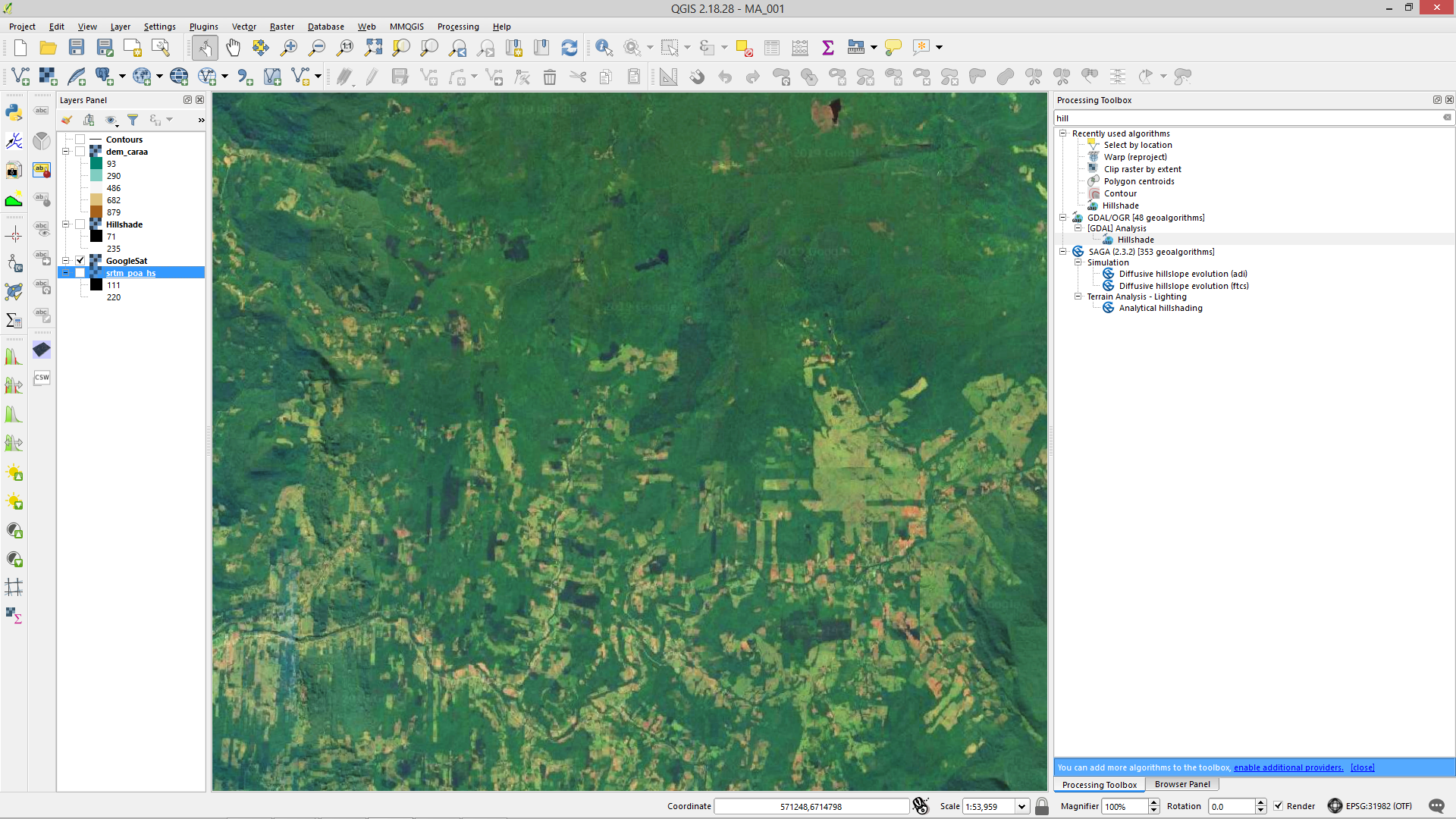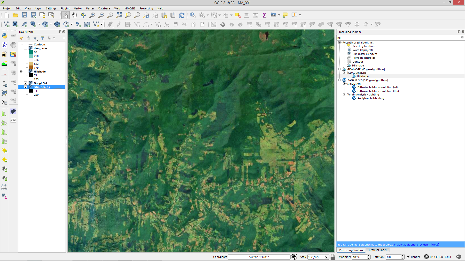 Obviamente, você precisa de um MDE para fazer essa análise. Eu fiz um post demonstrando como produzir um MDE a partir dos dados brutos da missão SRTM. Clique aqui para acessar o post. Siga os passos até o final, reprojetando o MDE para coordenadas planas (a não ser que seu MDE seja gigante, de abrangência nacional ou algo do gênero).