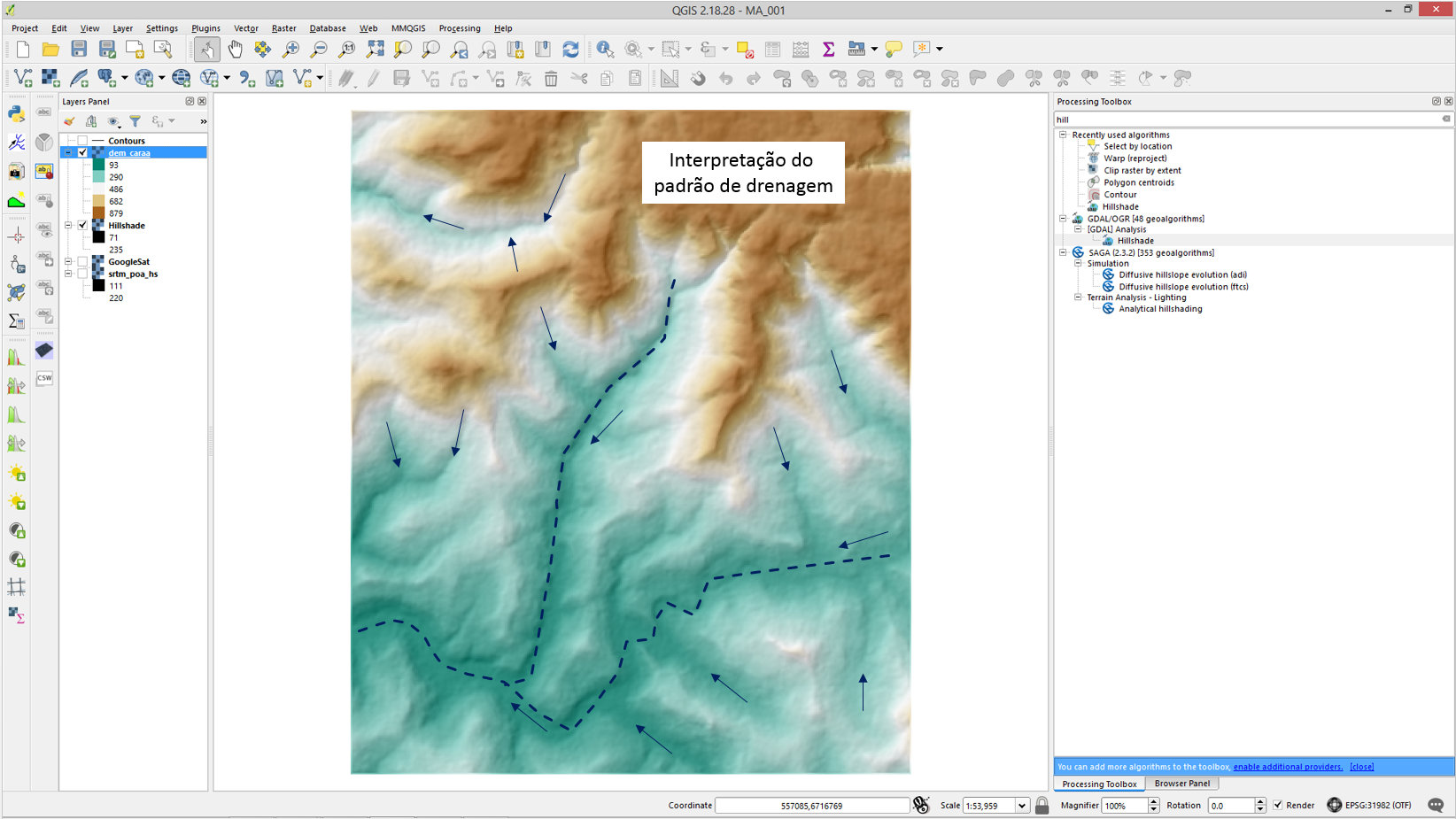 Se o seu terreno for bastante acidentado, é possível interpretar o padrão de drenagem por uma simples inspeção visual. E aqui entra em cena novamente o Modelo Digital de Elevação (MDE) como dado fundamental para a análise.