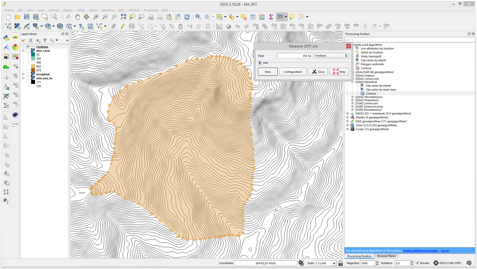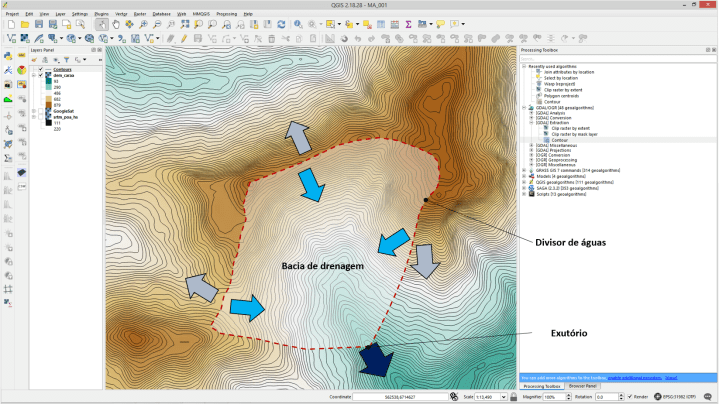 Com as curvas de nível, podemos resolver esse problema de forma muito prática no QGIS. A partir do ponto exutório, desenhe manualmente a área de bacia, seja pela ferramenta de mensuração de área, seja ao editar os vértices do polígono de um shapefile criado para esse propósito. Só precisa ter o cuidado de manter o divisor de águas sempre ortogonal às curvas de nível. Esse é o método expedito.