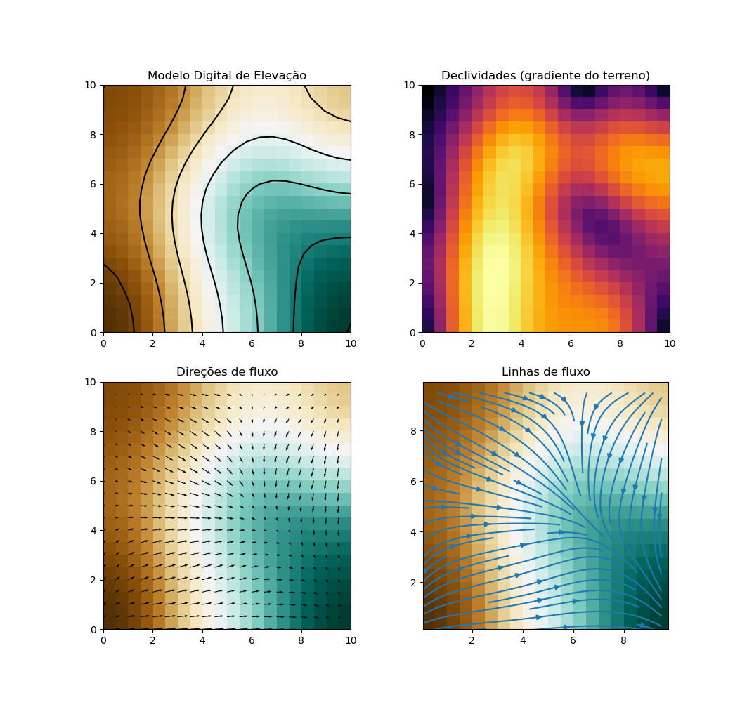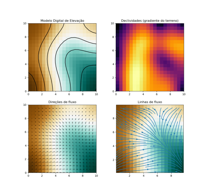 Sendo uma matriz, podemos aplicar diversas técnicas de computação para identificar o gradiente do terreno, a direção de fluxo e para onde o fluxo aponta. O processo é análogo ao cálculo diferencial de duas variáveis, com x e y sendo a longitude e a latitude, e z sendo a altitude do terreno. A vantagem é que o QGIS faz as contas para nós.