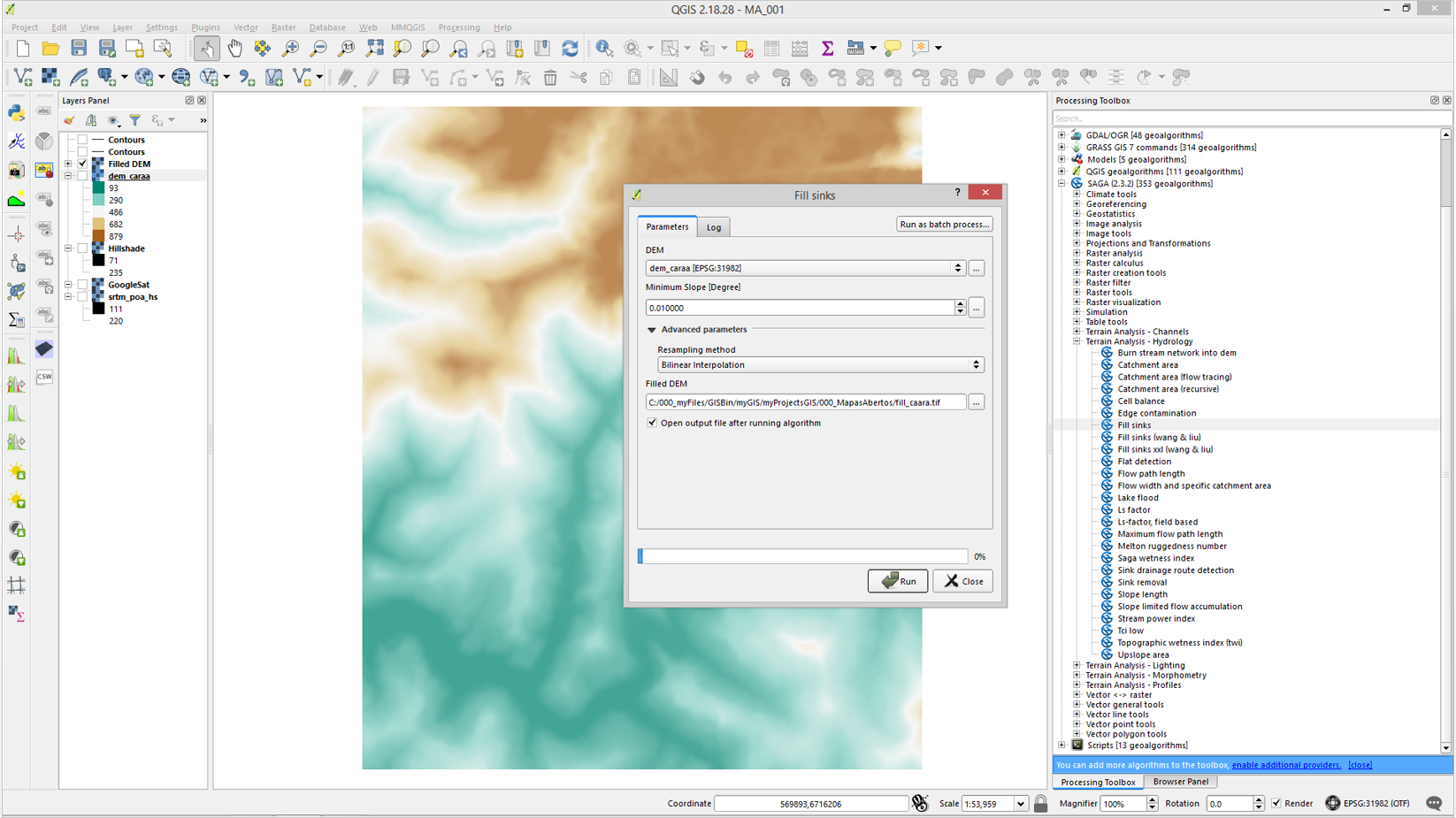 Se você não acredita que existem depressões no terreno, observe as curvas de nível no seu MDE original e depois compare com as curvas de nível do MDE gerado pelo SAGA Fill Sinks. Se você encontrar curvas fechadas em lugares como vales ou planícies, ali existe uma depressão. No meu MDE, encontrei várias, de vários tamanhos.