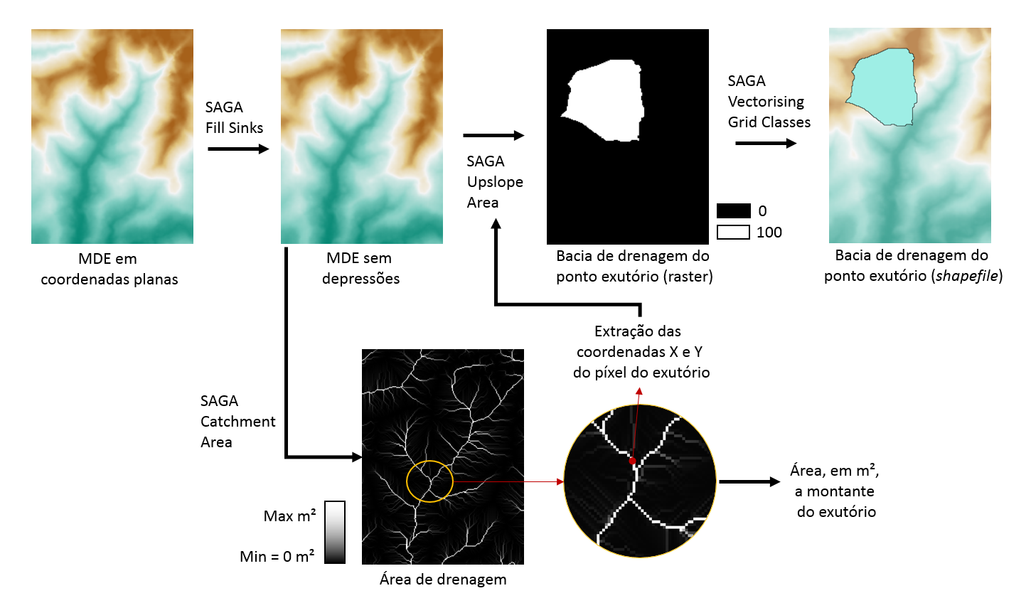 Sim, é possível. Mas exite uma parte muito sensível ao processo: quando o usuário precisa inspecionar o raster de “Catchment Area” e obtêm ali as coordenadas X e Y do píxel que se deseja analisar como ponto exutório. Dá para automatizar esse procedimento, pedindo para o usuário um shapefile de ponto e fazendo as contas para aproximar o píxel exutório a partir desse ponto. Mas essa parte eu vou deixar para um outro post.