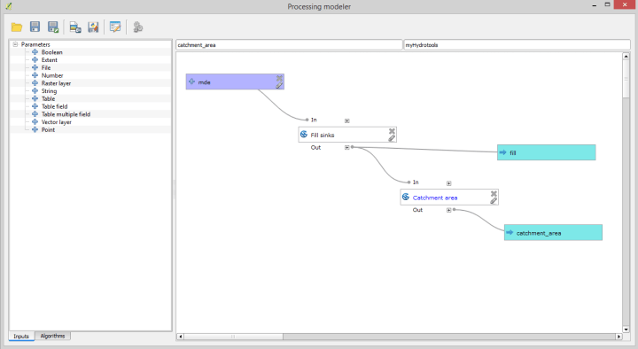 O primeiro procedimento automático é a geração do MDE sem depressões e a consequente geração do raster de área acumulada (Catchment Area). Usando o Modelador de processos, o processo ficou assim: