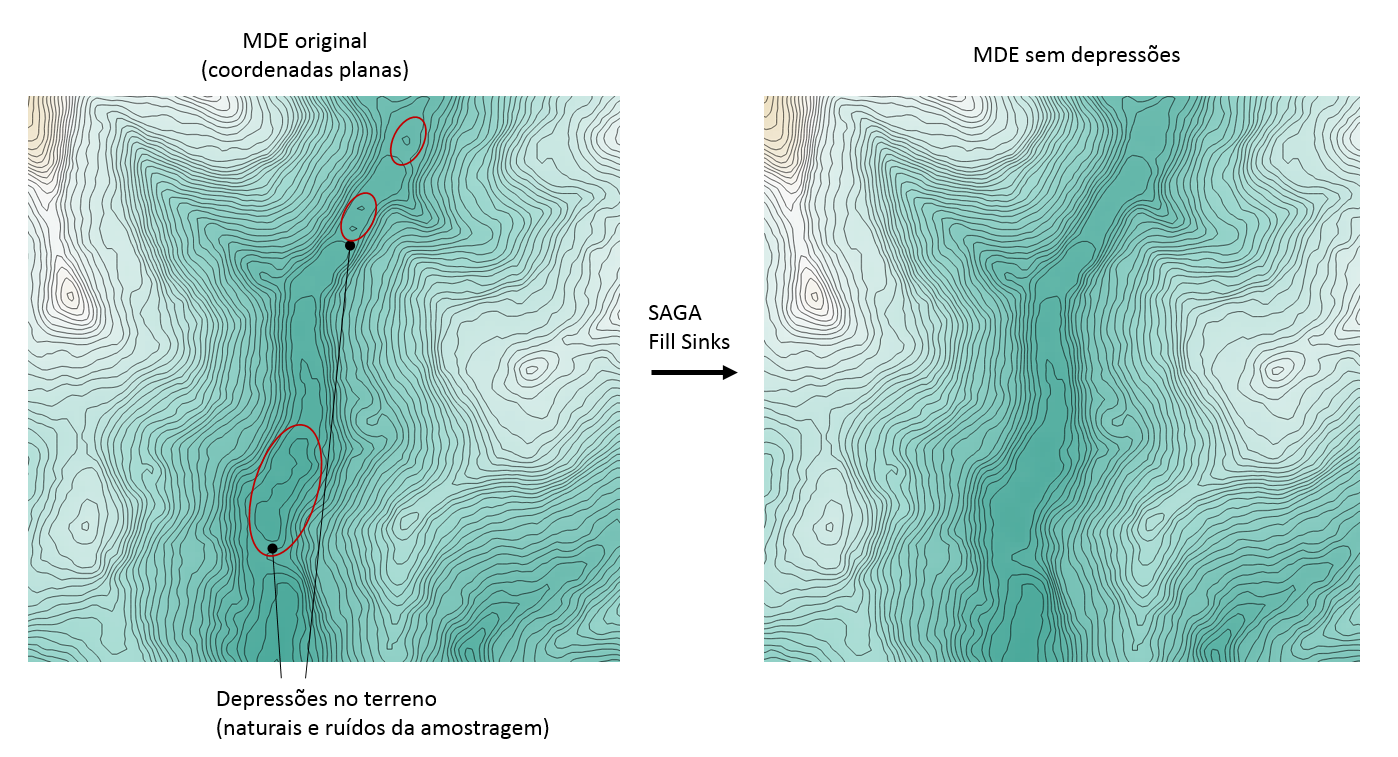 A primeira etapa consiste em produzir um MDE sem depressões no terreno. Os “buracos” no terreno podem ser resultado direto da mensuração do sensor que produziu o dado ou produzidas durante os processos de confecção do mosaico e reprojeção do MDE. Na primeira alternativa, podem ser depressões legítimas do terreno ou depressões ilegítimas, como em lugares muito planos onde até mesmo talhões de eucalipto são detectados como pequenas elevações no terreno. Ainda também existe a possibilidade de serem resultados aleatórios do processo de coleta do dado, um ruído.