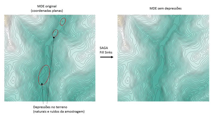 Se você leu esse outro post aqui, deve se lembrar que os MDE podem apresentar depressões legítimas ou ilegítimas no terreno. Não queremos elas! Aterre todas com algum geoalgoritmo disponível. No post anterior usamos o SAGA Fill Sinks. Se o seu MDE é grande, não se assuste com a demora de processamento. (Geralmente demora porque, ao preencher as depressões, o algoritmo acaba produzindo eventuais novas depressões, o que o faz entrar em um processo recursivo exaustivo!)