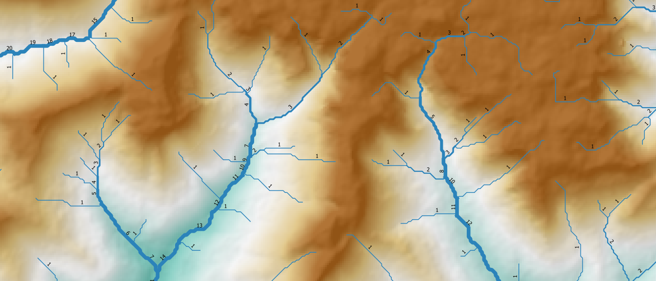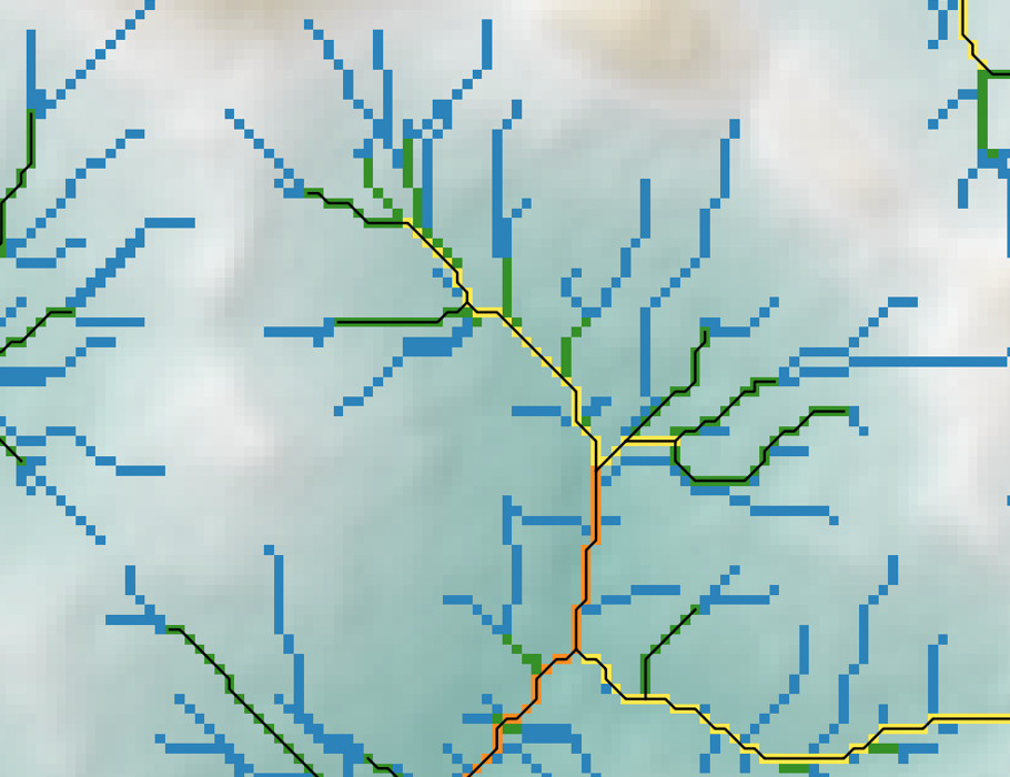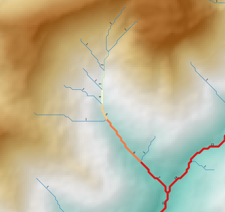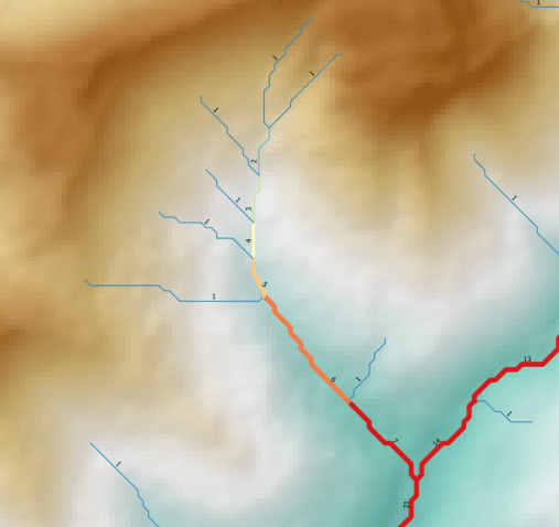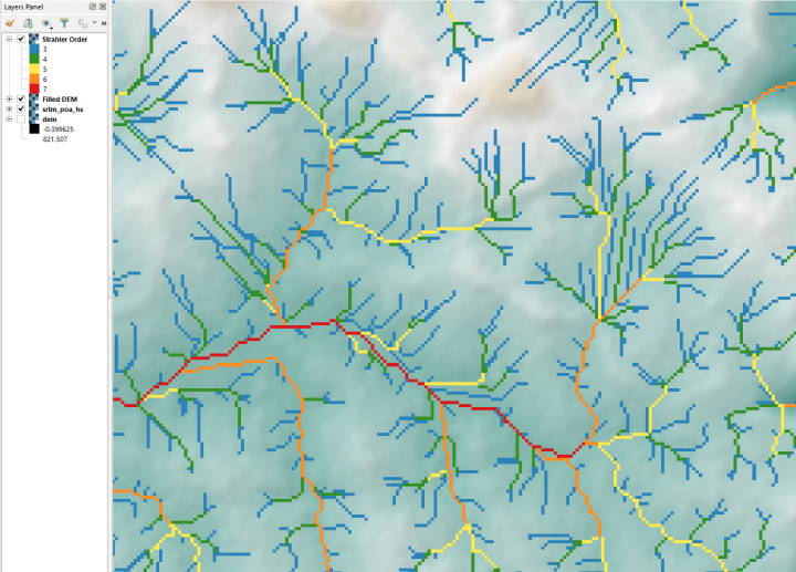 Se vamos usar o Strahler Order, queremos que a rede de drenagem seja gerada para valores maiores que , digamos, ordem 4 (cor verde na figura anterior). A escolha depende se suas ambições de densidade de drenagem! Mas, repare, se escolher ordem 1 para o limiar, você terá uma densidade que abrange todos os píxeis do MDE, o que é algo inusitado (além de custoso em termos de processamento).
