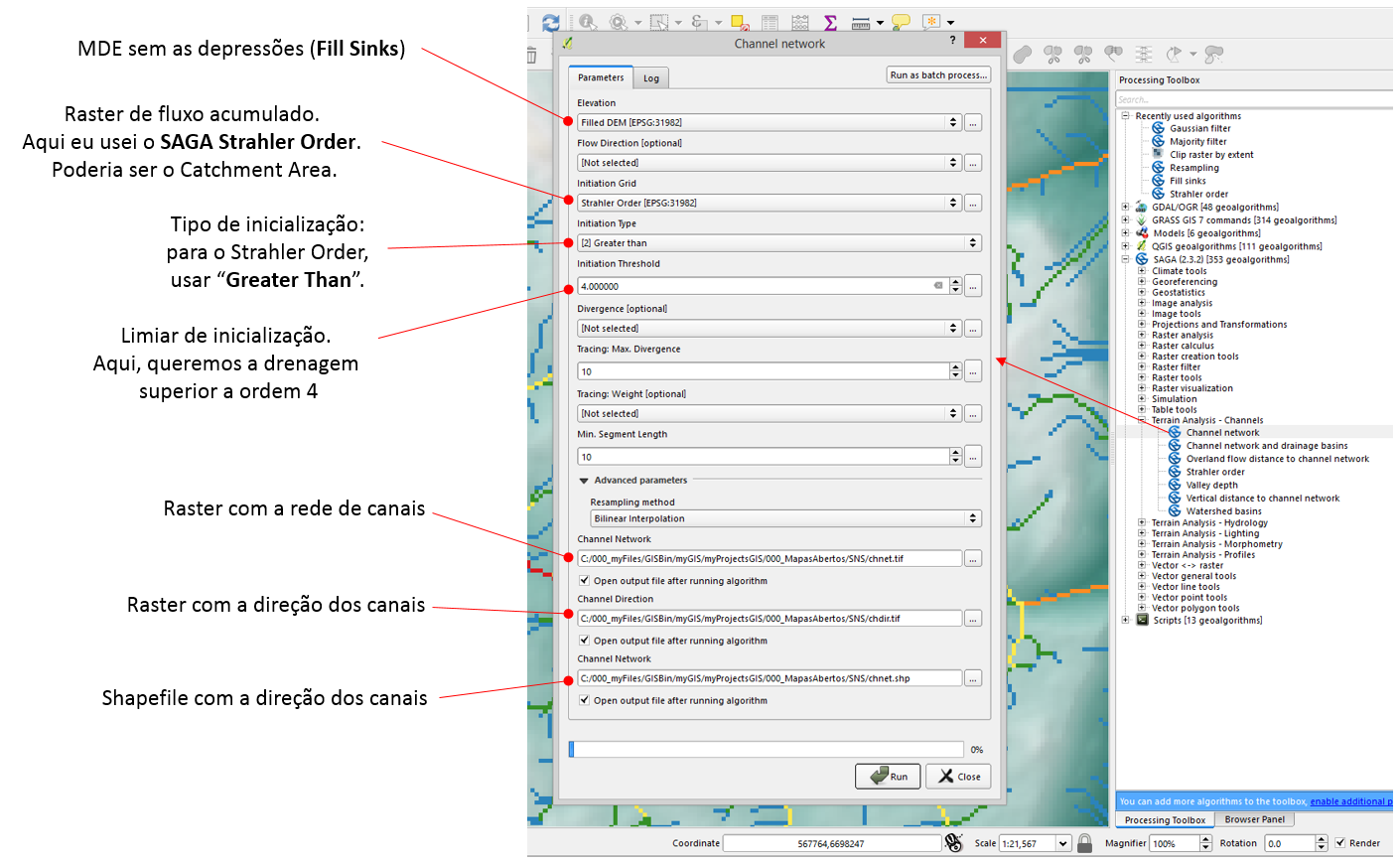 Esse algoritmo precisa do MDE sem as depressões, obtido pelo SAGA Fill Sinks, e um raster que reprenta o fluxo acumulado, que aqui vamos usar o raster produzido pelo SAGA Strahler Order. Poderia ser outro? Sim, poderia ser o raster do SAGA Catchment Area ou qualquer outro raster similar, de fluxo acumulado.