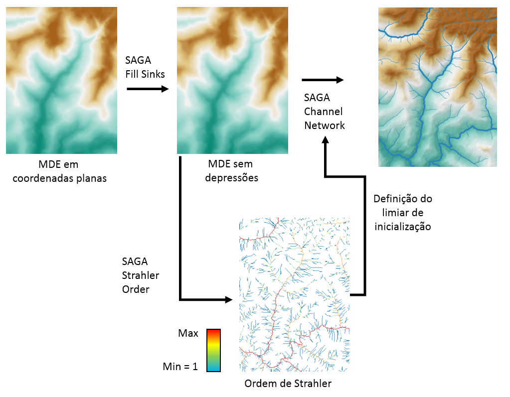 Um comentário importante sobre o raster de ordem de Strahler: ele representa a ordem da rede de drenagem do MDE, não a rede vetorial gerada! Portanto, a ordem da rede vetorial gerada é outra, e pode ser calculada usando a regra de Strahler.
