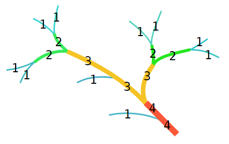 Outro comentário, para não gerar confusão: uma coisa legal do SAGA Channel Network é que ele cria um atributo de “ordem” na rede de drenagem gerada. Essa “ordem” não é a ordem de Strahler, mas sim a ordem de Shreve, que segue uma regra diferente: a ordem de cada trecho da rede é a soma dos trechos confluentes. Isso é legal por que podemos estilizar o shapefile em função disso, tanto a cor como a espessura da linha, melhorando bastante a visualização da rede.