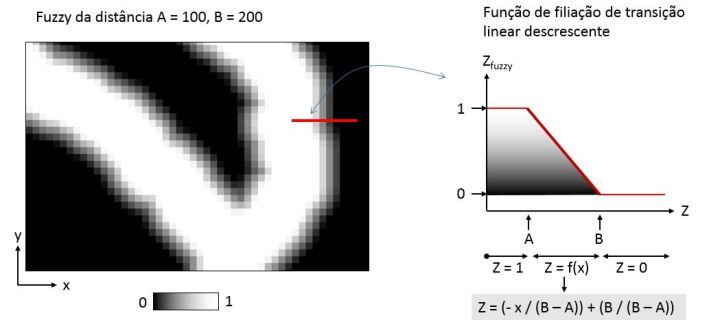 (“proximidade@1” <= A) + (“proximidade@1” > A) * (“proximidade@1” < B) * ((- “proximidade@1” / (B – A)) + (B / (B – A)) )