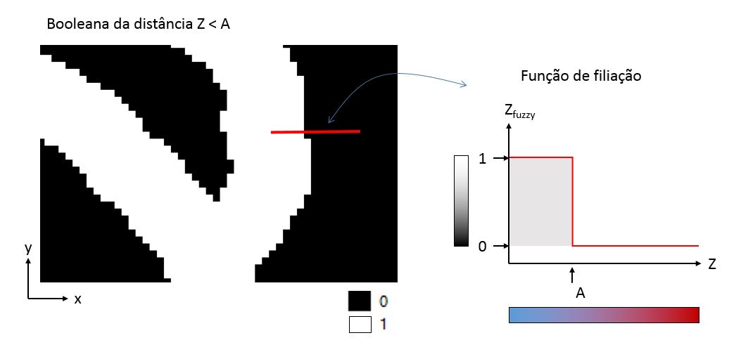 Na lógica booleana, não existem meias verdades. É ou não é. Ou é verdadeiro ou é falso. Em se tratando de variáveis espaciais, a lógica booleana prediz a posição de uma feição com 100% de certeza. Quando rasterizamos uma camada vetorial, geralmente obtemos uma imagem booleana com píxeis de 0 (onde é falso) e 1 (onde é verdadeiro). A “função de filiação” da lógica booleana é uma função discreta plana que apresenta discontinuidades entre o “verdadeiro” e o “falso”.