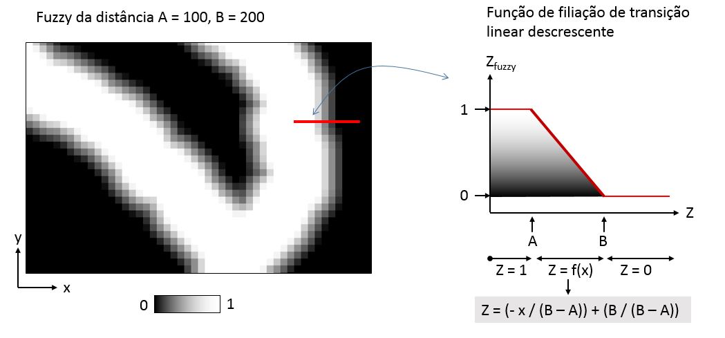 A lógica fuzzy antagoniza a lógica booleana. Na lógica fuzzy, as fronteiras das feições ficam “embaçadas”, “difusas” (por isso, fuzzy). A função de filiação na lógica fuzzy faz transições contínuas entre o verdadeiro e o falso, ou seja a imagem fuzzy apresenta píxeis que variam entre o zero e o um. São os cinquenta tons de cinza do geoprocessamento.