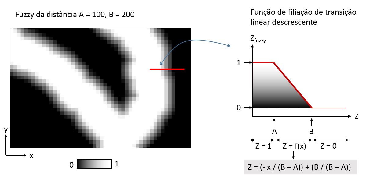 (“proximidade@1” <= A) + (“proximidade@1” > A) * (“proximidade@1” < B) * ((- “proximidade@1” / (B – A)) + (B / (B – A)) )