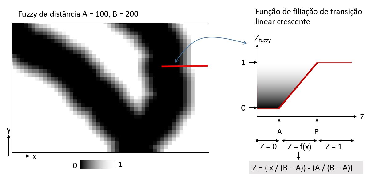 Escolher a função de filiação pode ser a parte mais delicada do processo. As funções podem ser complexas e ter muitos parâmetros que em teoria precisam ser calibrados ou pelo menos verificados por opinião especialista. Considere a função de transição linear apresentada acima. Ainda que simples, ela possui dois parâmetros: a distância A, onde começa a transição linear, e a distância B, onde termina a transição.