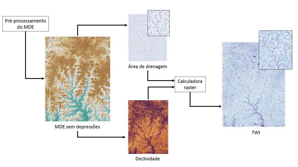 O mapeamento é possível por que existe um índice topográfico que reflete a tendência da água subterrânea aflorar em um ponto qualquer do terreno. Esse índice chama-se TWI, de “topographical wetness index” e pode ser derivado de um modelo digital de elevação no QGIS.