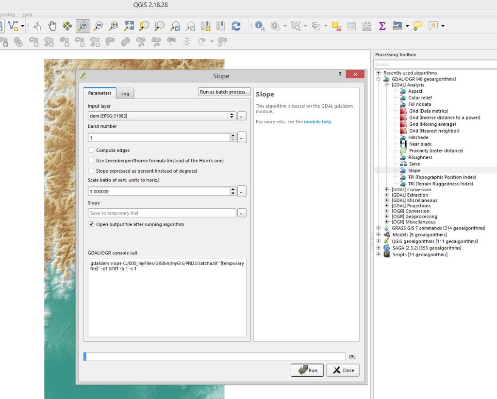 Esse passo é para ser bem mas rápido. Uma opção é ir em GDAL/OGR – [GDAL] Analysis e selecionar a ferramenta Slope. Só precisa indicar o MDE.